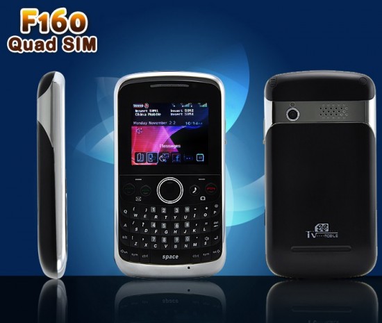 This Flying F160 is the world’s first Quad SIM card, quad standby mobile phone. Quite why you’d need four SIM cards in your phone is another matter, although I suppose for permanent travellers this could save a bunch of time swapping out cards when you cross a border Read more: http://realitypod.com/2011/03/worlds-first-4-sim-mobile-phone-launched/#ixzz1ZOL267oH The rest of the spec is pretty so-so, with a 2 inch touchscreen, TV & FM radio, 0.3 mp camera and a choice of colors. Priced, however, at a very reasonable $75.00 unlocked. Quick Overview 4 SIM, 4 Standby Quad Band GSM Full QWERTY Keyboard FM Radio Dual Cameras Bluetooth MP3, Video Player Quad Band GSM